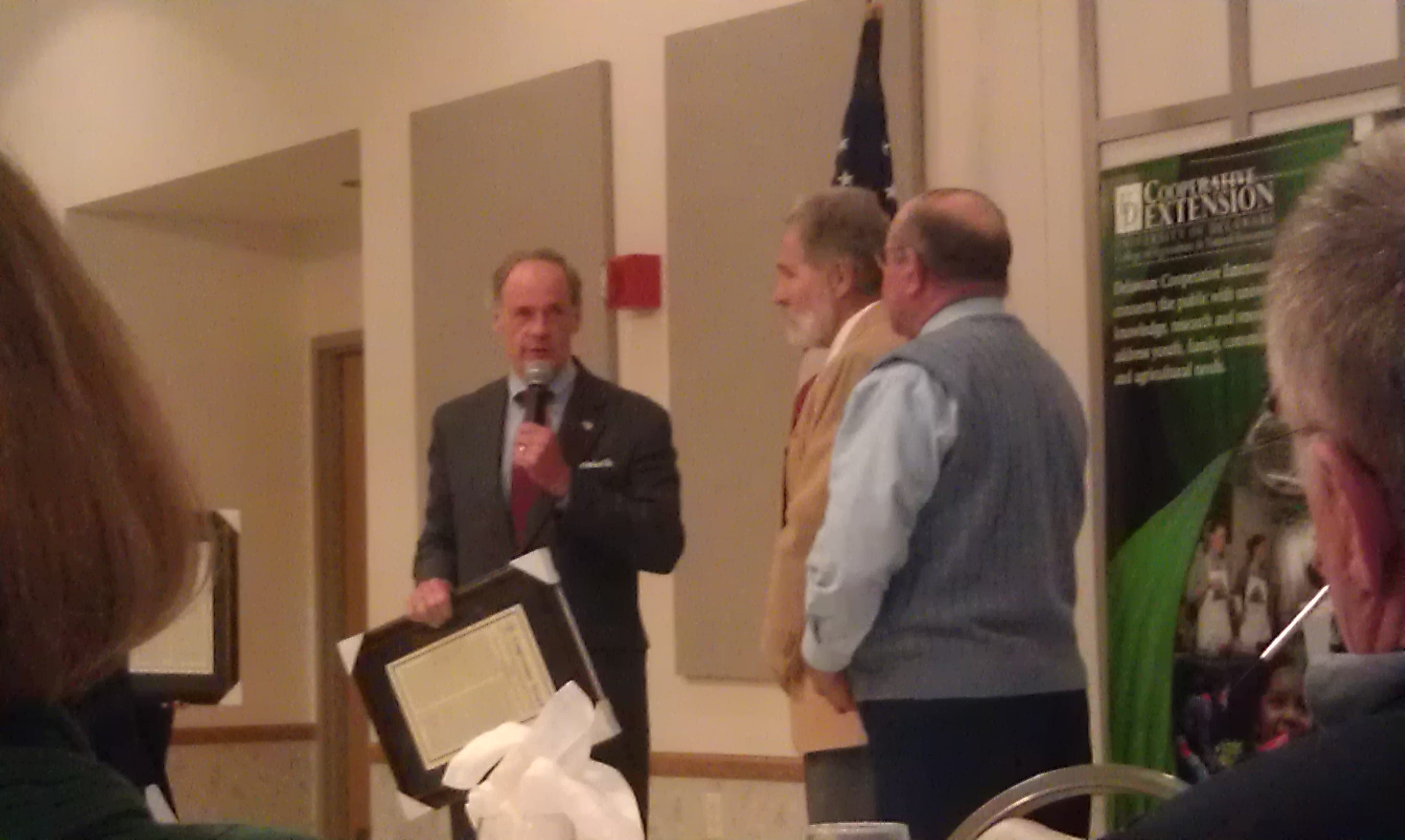 Scheduled to headline the program was the Governor, Jack Markell and our senior U.S. Senator, Tom Carper. The Governor was a no-show and the Senator was late but the show went on. Replacing the Governor, DE Secretary of Agriculture-Ed Kee, spoke on the new programs recently initiated for DE farmers such as DRIP and the Young Farmer Program. He also announced that the recent CAFO (Confined Animal Feeding Operations) regulations DE proposed were officially approved. Senator Carper finally arrived and reminisced on the environmental woes of the Inland Bays, which occurred during the Castle administration and derived the need for a Nutrient Management Commission. The members of this commission were to represent various sectors of all involved in nutrient management processes; requiring all to have a seat at the table and collaborate on a state plan. With the recent CAFO proposal being approved, Carper called this a huge accomplishment and wanted to honor the chairmen of the board, who have served since its inception. He presented a “Congressional Record” to Dave Baker, Vice-Chair and Bill Vanderwende, Chair (and my grandfather).