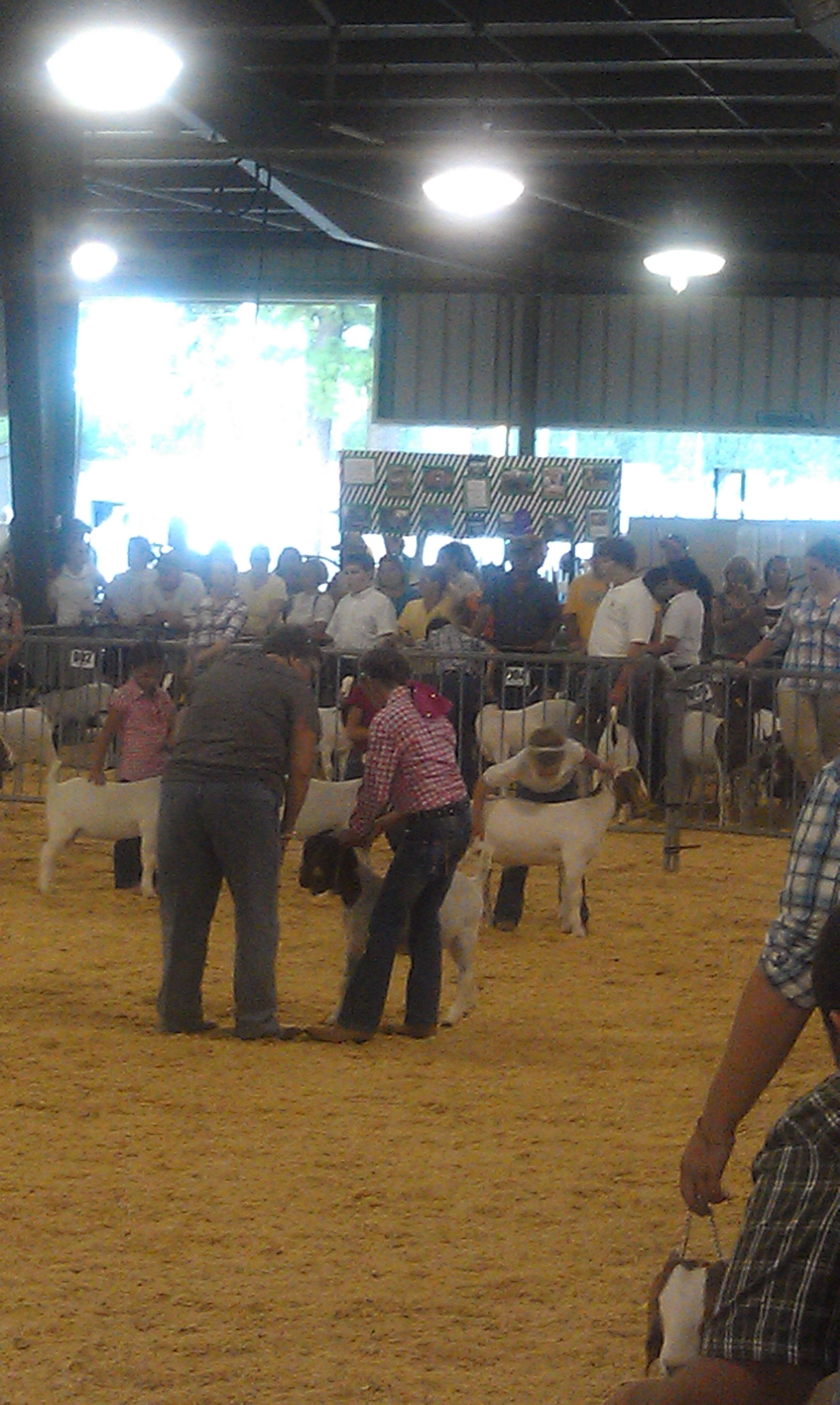 Maci showing her Boer goat, Patches, and speaking to the judge.