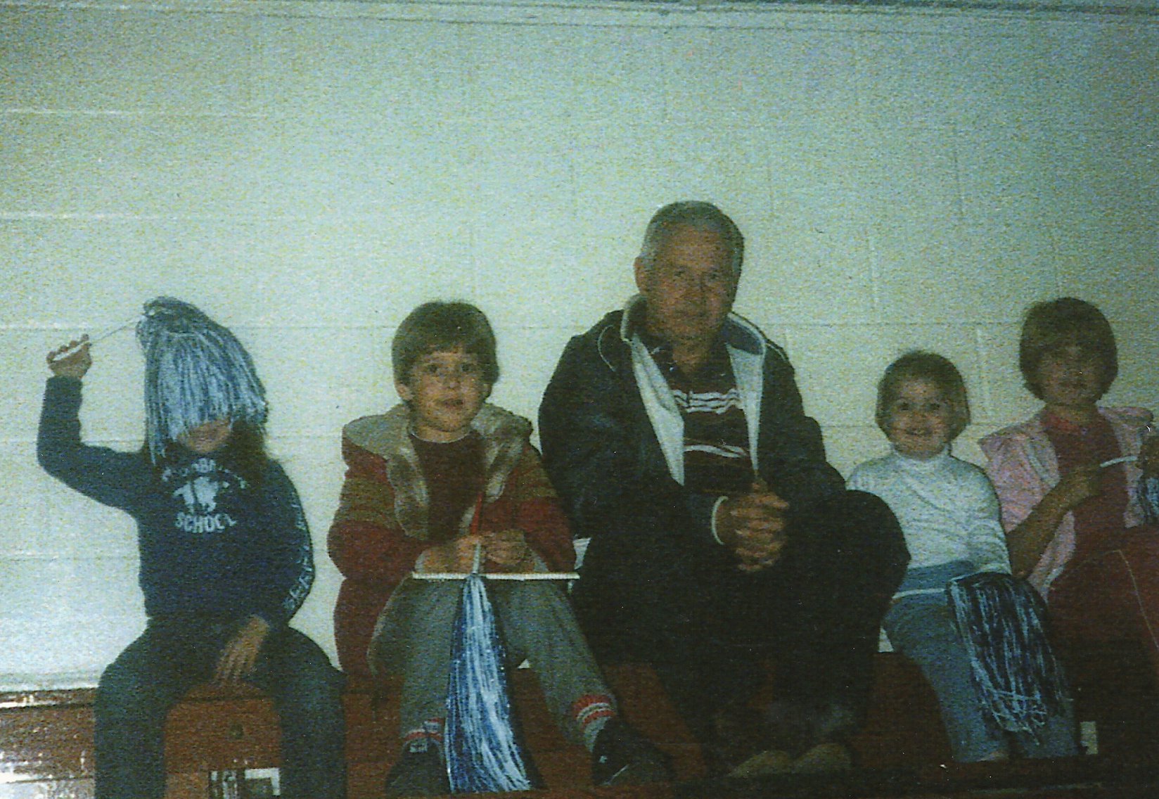 Sitting on the top row of Woodbridge Elementary School bleachers. I have no idea what we were watching. I am the one underneath the pom-pom. (Christy, Derek, Pop-Pop, Devon, Danna)